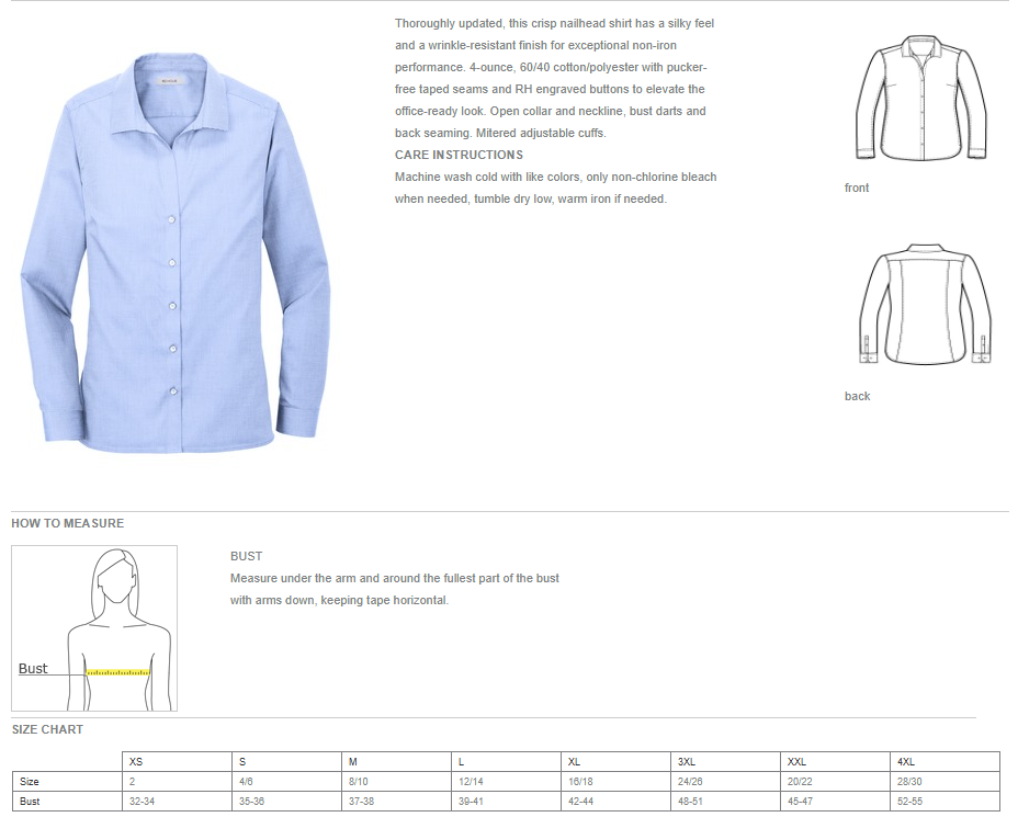 Thoroughly updated, this crisp nailhead shirt has a silky feel and a wrinkle-resistant finish for exceptional non-iron performance. 4-ounce, 60/40 cotton/polyester with pucker-free taped seams, RH engraved buttons to elevate the office-ready look. Open collar and neckline, bust darts and back seaming. Mitered adjustable cuffs.